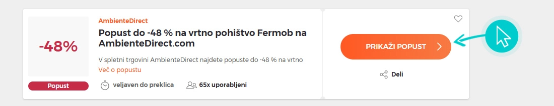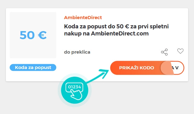 Na naši spletni strani izberite določeno kodo za popust, ki jo želite uporabiti v spletni trgovini AmbienteDirect. Kliknite oranžni gumb "Prikaži kodo".