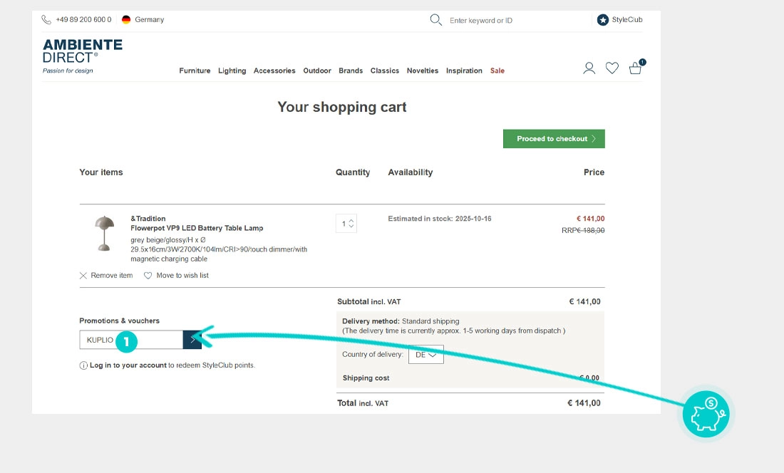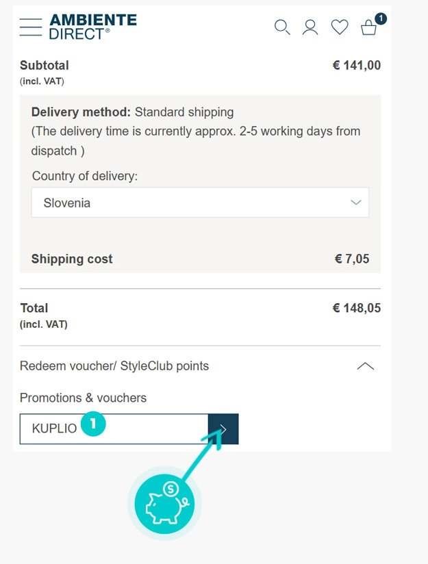 V spletni trgovini AmbienteDirect izberite izdelek, ki vas zanima, kliknite gumb »Dodaj v košarico« in izdelek bo samodejno dodan v spletno košarico. V spletni košarici pod povzetkom naročila najdete polje »Vaš darilni kupon«. Tam prilepite kopirano kodo za popust ali jo vnesite ročno in potrdite z gumbom puščice desno.