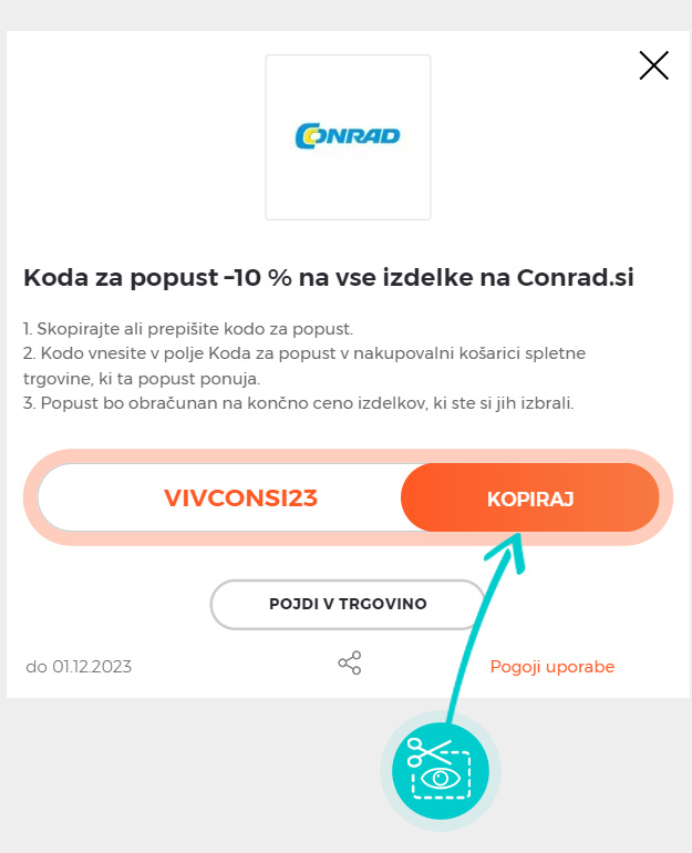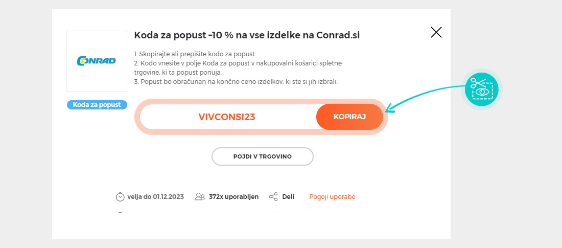 Kopirajte ali prepišite kodo za popust in kliknite gumb »Pojdi v trgovino«. Nato boste preusmerjeni neposredno v spletno trgovino Conrad.si.