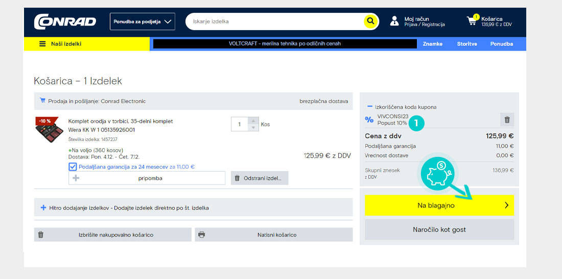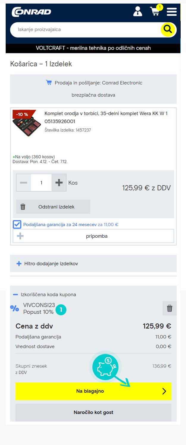 V spletni trgovini Conrad izberite izdelek, ki vas zanima, pritisnite gumb "Dodaj" in izdelek bo samodejno dodan v spletno košarico. V spletni košarici pod izdelkom najdete razdelek »Dodajte kupon za popust«, kjer se nahaja polje »Dodajte kupon«. Tam prilepite kopirano kodo za popust ali jo vnesite ročno in potrdite z gumbom »Unovčite«.