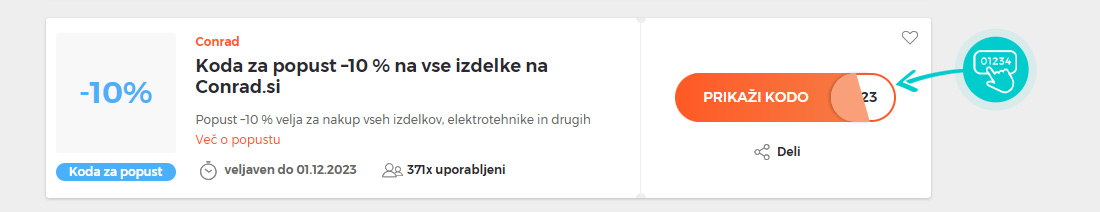 Na naši spletni strani izberite določeno kodo za popust, ki jo želite uporabiti v spletni trgovini Conrad.si. Kliknite oranžni gumb "Prikaži kodo".