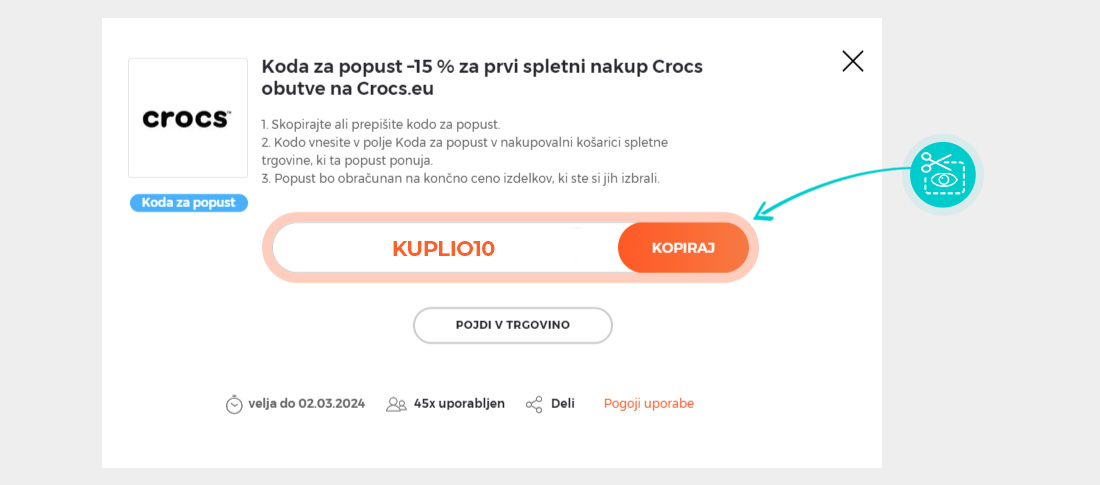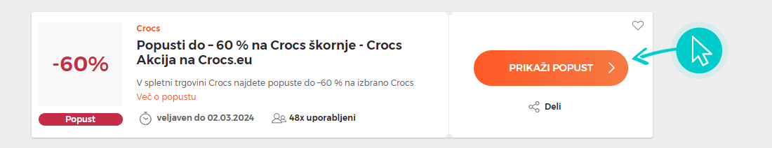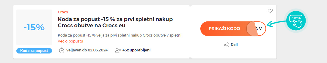 Na naši spletni strani izberite določeno kodo za popust, ki jo želite uporabiti v spletni trgovini Crocs.eu. Kliknite oranžni gumb "Prikaži kodo".