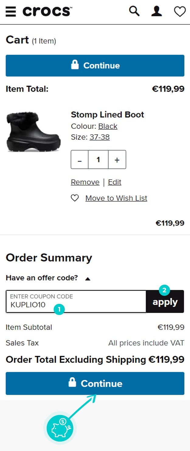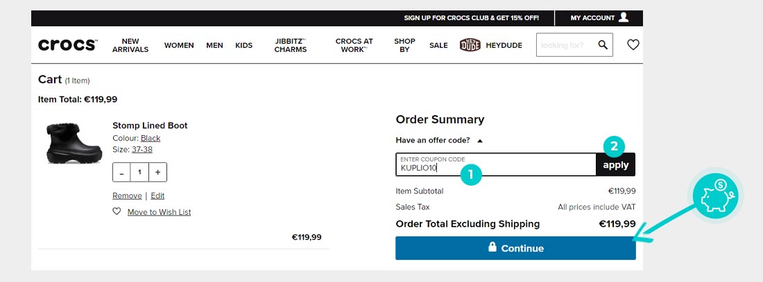 V spletni trgovini Crocs.eu izberite izdelek, ki vas zanima, kliknite gumb "Dodaj v košarico" in izdelek bo samodejno dodan v spletno košarico. V spletni košarici pod izdelkom najdete razdelek »Imate kodo«, kjer se nahaja polje »Koda kupona«. Tam prilepite kopirano kodo za popust ali jo vnesite ročno in potrdite z gumbom »Uporabi«.