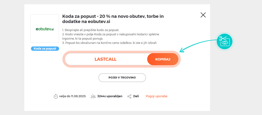 Kopirajte ali prepišite kodo za popust in kliknite gumb »Pojdi v trgovino«. Nato boste preusmerjeni neposredno v spletno trgovino Eobutev.si.