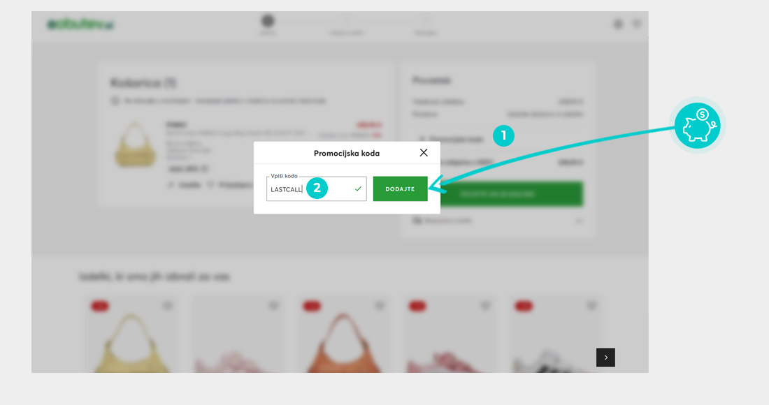 V spletni trgovini Eobutev izberite izdelek, ki vas zanima, kliknite gumb "Dodaj v košarico" in izdelek bo samodejno dodan v spletno košarico. V spletni košarici pod izdelkom najdete polje »Promocijska koda«, kjer se nahaja polje »koda«. Tam prilepite kopirano kodo za popust ali jo vnesite ročno in potrdite z gumbom »Dodaj«.