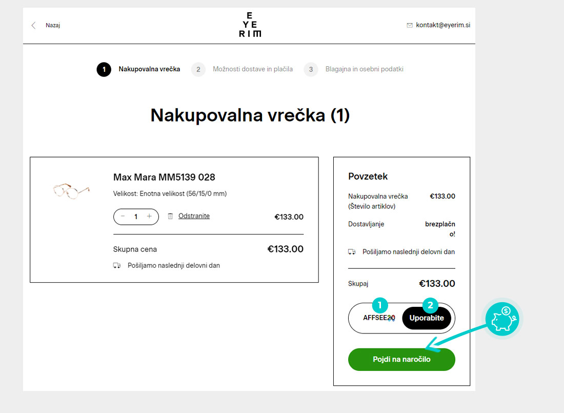 Kopirajte ali prepišite kodo za popust in kliknite gumb »Pojdi v trgovino«. Nato boste preusmerjeni neposredno v spletno trgovino Eyerim.si.