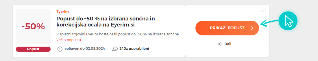 Na naši spletni strani izberite določeno kodo za popust, ki jo želite uporabiti v spletni trgovini Eyerim. Kliknite oranžni gumb "Prikaži kodo".