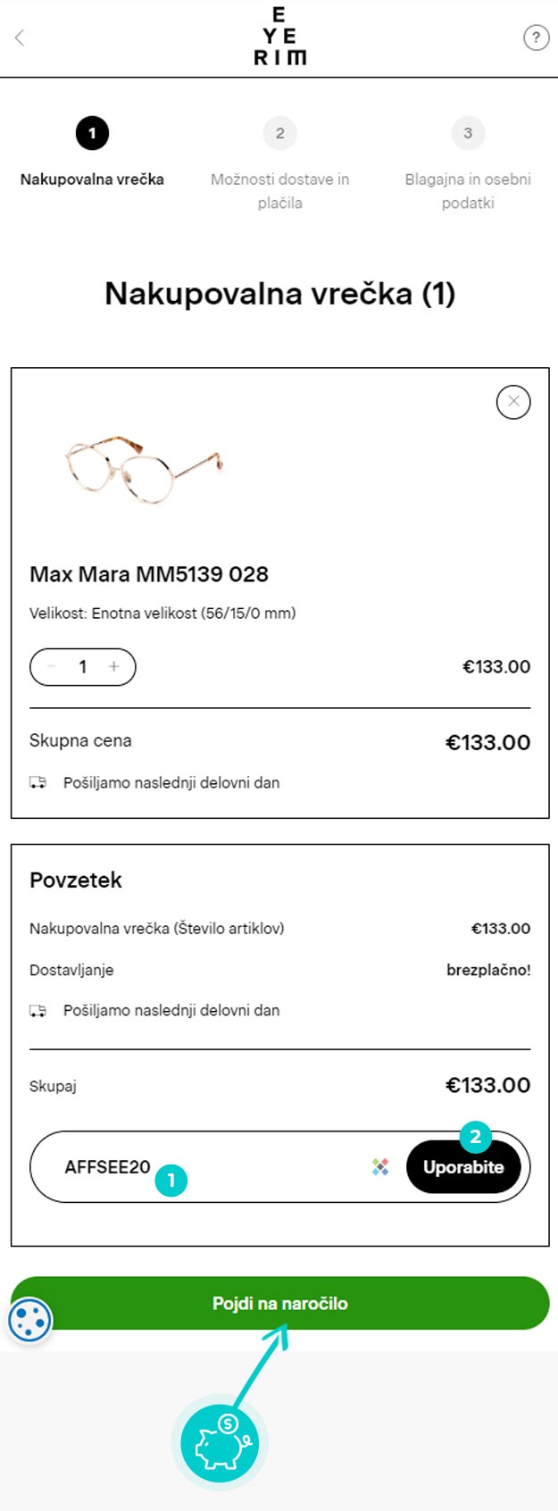 V spletni trgovini Eyerim izberite izdelek, ki vas zanima, kliknite gumb "Dodaj v košarico" in izdelek bo samodejno dodan v spletno košarico. V spletni košarici pod izdelkom najdete razdelek »Koda za popust«, kjer se nahaja polje »Tukaj dodajte svojo kodo za popust«. Tam prilepite kopirano kodo za popust ali jo vnesite ročno in potrdite z gumbom »Uporabite«.