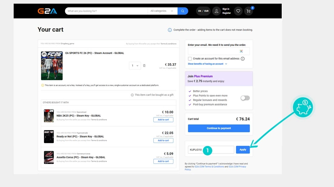 V spletni trgovini G2A izberite izdelek, ki vas zanima, kliknite gumb »Dodaj v košarico« in izdelek bo samodejno dodan v spletno košarico. V spletni košarici na desni strani najdete polje za vnos kode. Tam prilepite kopirano kodo za popust ali jo vnesite ročno in potrdite z gumbom »Uporabi«.