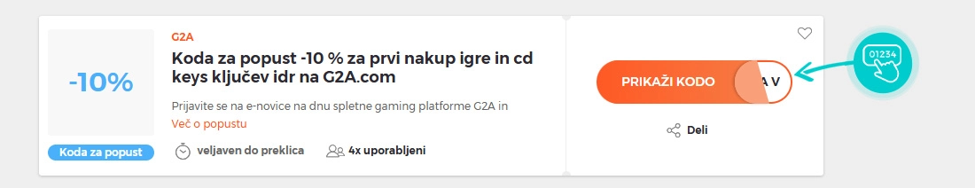 Na naši spletni strani izberite določeno kodo za popust, ki jo želite uporabiti v spletni trgovini G2A. Kliknite oranžni gumb "Prikaži kodo".