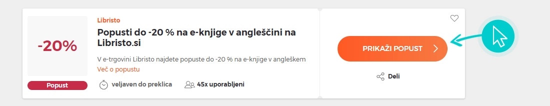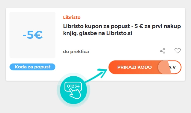 Na naši spletni strani izberite določeno kodo za popust, ki jo želite uporabiti v spletni trgovini Libristo. Kliknite oranžni gumb "Prikaži kodo".