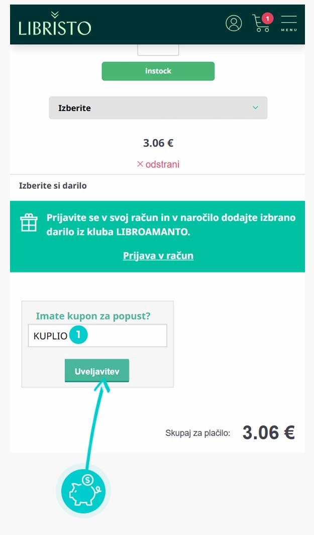 V spletni trgovini Libristo izberite izdelek, ki vas zanima, kliknite gumb " Dodaj v košarico" in izdelek bo samodejno dodan v spletno košarico. V spletni košarici pod izdelkom najdete polje »Imate kupon za popust?«, kjer se nahaja prazno polje. Tam prilepite kopirano kodo za popust ali jo vnesite ročno in potrdite z gumbom »Uveljavi«.