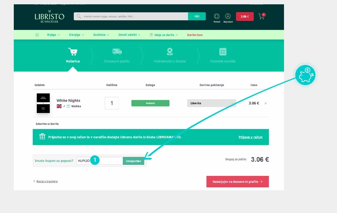 Kopirajte ali prepišite kodo za popust in kliknite gumb »Pojdi v trgovino«. Nato boste preusmerjeni neposredno v spletno trgovino Libristo.