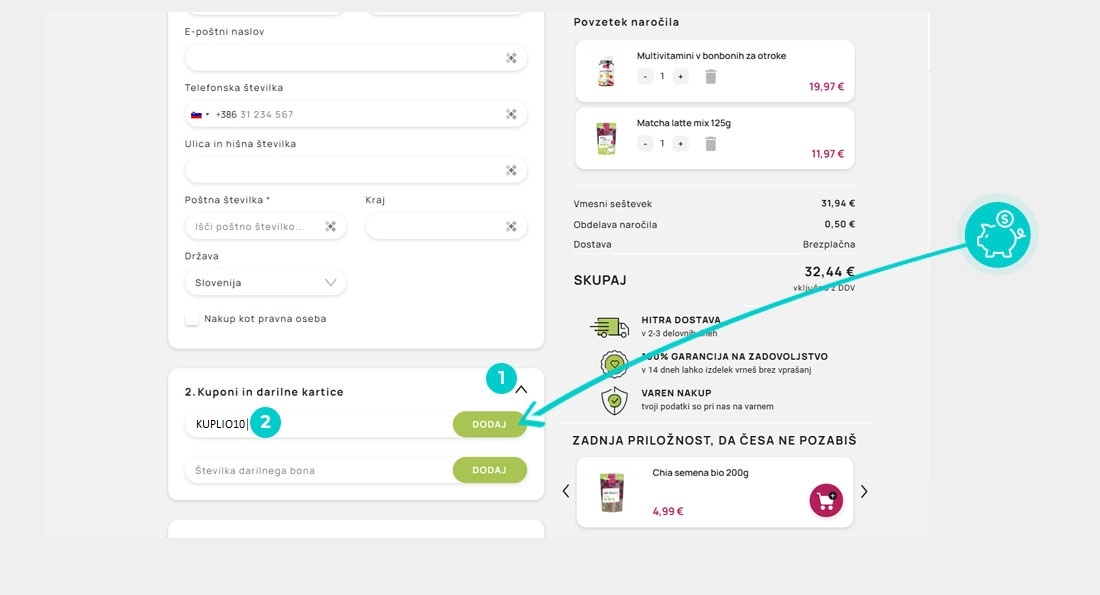 V spletni trgovini Malinca izberite izdelek, ki vas zanima, kliknite gumb "V košarico" in izdelek bo samodejno dodan v spletno košarico. V spletni košarici pod izdelkom najdete polje »Kuponi in darilne kartice«, kjer se nahaja polje »koda«. Tam prilepite kopirano kodo za popust ali jo vnesite ročno in potrdite z gumbom »Dodaj«.