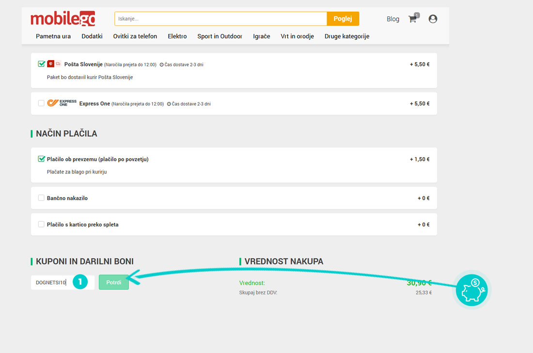 V spletni trgovini Mobilego izberite izdelek, ki vas zanima, kliknite gumb "Dodaj v košarico" in izdelek bo samodejno dodan v spletno košarico. V spletni košarici pod izdelkom najdete polje »Kuponi in darilni boni«, kjer se ob kliku odpre polje »koda za popust«. Tam prilepite kopirano kodo za popust ali jo vnesite ročno in potrdite z gumbom »Potrdi«.