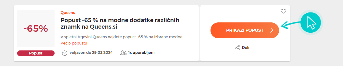 Izberite določen kupon Queens na naši spletni strani in kliknite gumb "Prikaži popust". Avtomatsko boste preusmerjeni neposredno na posebno ponudbo v spletni trgovini Queens, kjer lahko izdelek kupite s popustom.