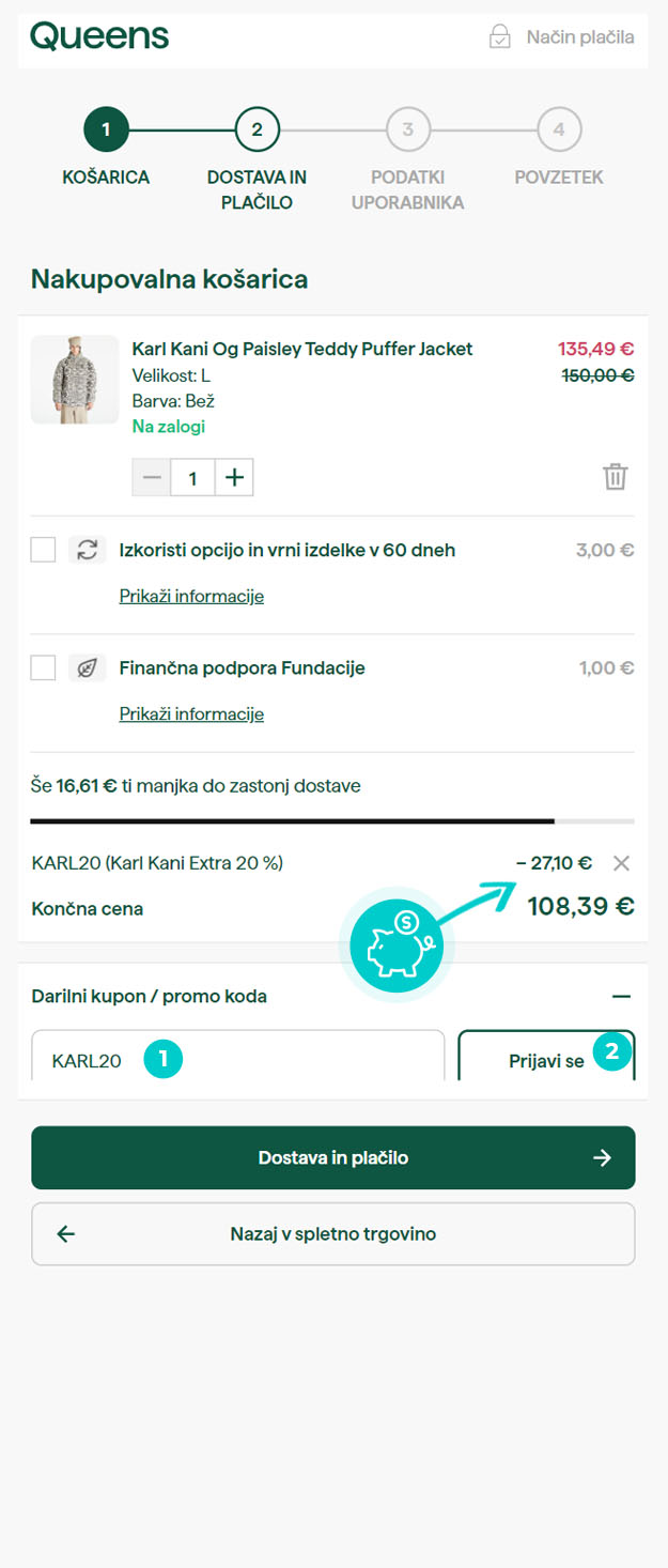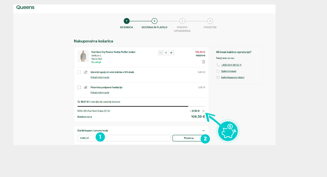 V spletni trgovini Queens izberite izdelek, ki vas zanima, kliknite gumb "Dodaj v košarico" in izdelek bo samodejno dodan v spletno košarico. V spletni košarici pod izdelkom najdete razdelek »Darilni kupon / promo koda«, kjer se nahaja polje »Vnesi kodo«. Tam prilepite kopirano promo kodo za popust ali jo vnesite ročno in potrdite z gumbom »Uporabi kodo«.