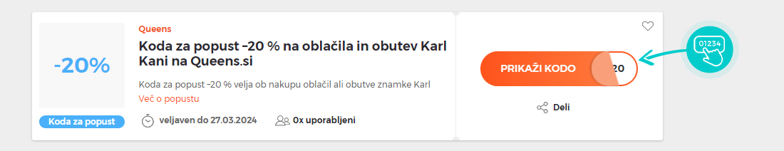 Na naši spletni strani izberite določeno kodo za popust, ki jo želite uporabiti v spletni trgovini Queens. Kliknite oranžni gumb "Prikaži kodo".