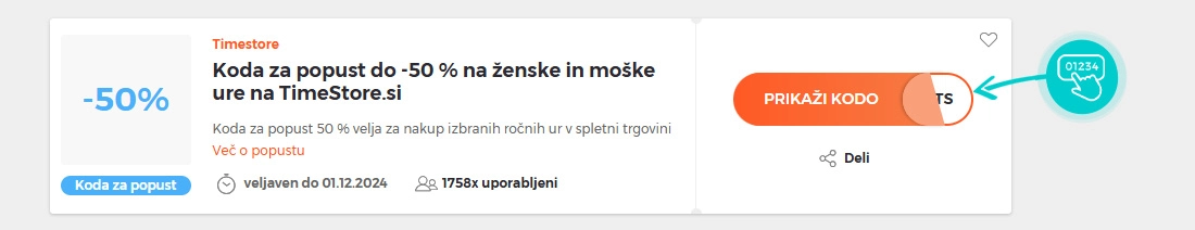 Na naši spletni strani izberite določeno kodo za popust, ki jo želite uporabiti v spletni trgovini Timestore. Kliknite oranžni gumb "Prikaži kodo".
