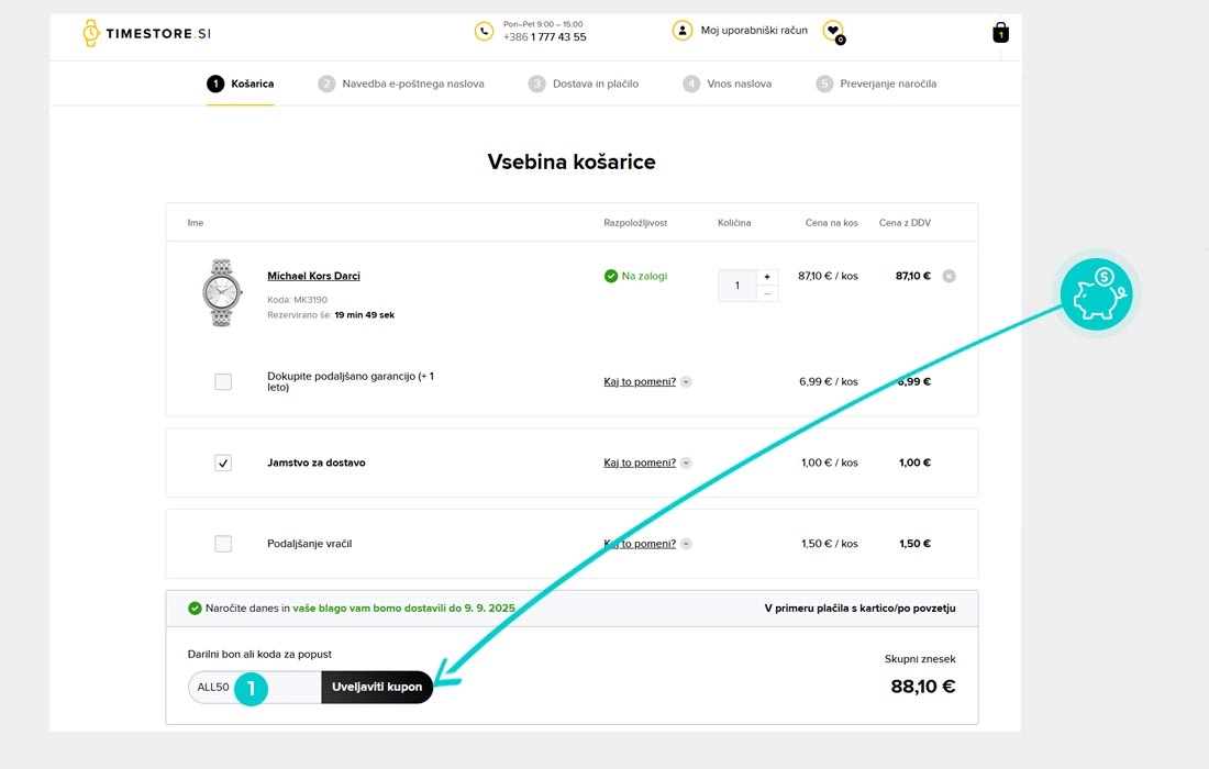 V spletni trgovini Timestore izberite izdelek, ki vas zanima, kliknite gumb "Kupi zdaj" in izdelek bo samodejno dodan v spletno košarico. V spletni košarici pod izdelkom najdete polje »Darilni bon ali koda za popust«. Tam prilepite kopirano kodo za popust ali jo vnesite ročno in potrdite z gumbom »Uveljavi kuponi«.