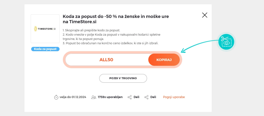 Kopirajte ali prepišite kodo za popust in kliknite gumb »Pojdi v trgovino«. Nato boste preusmerjeni neposredno v spletno trgovino Timestore.