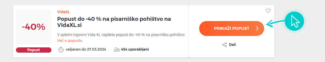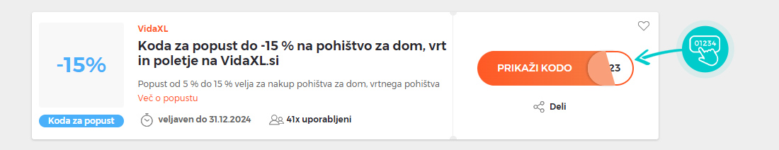 Na naši spletni strani izberite določeno kodo za popust, ki jo želite uporabiti v spletni trgovini Vida XL. Kliknite oranžni gumb "Prikaži kodo".