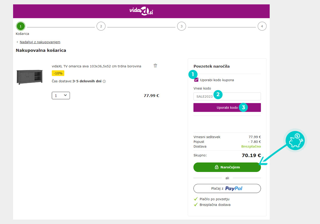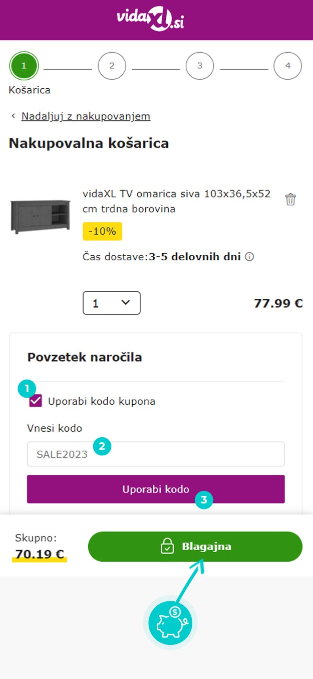 V spletni trgovini Vida XL izberite izdelek, ki vas zanima, kliknite gumb "Želim" in izdelek bo samodejno dodan v spletno košarico. V spletni košarici pod izdelkom najdete razdelek »Povzetek naročila«, kjer se nahaja polje »Uporabi kodo kupona«. Tam prilepite kopirano promo kodo za popust ali jo vnesite ročno in potrdite z gumbom »Uporabi kodo«.